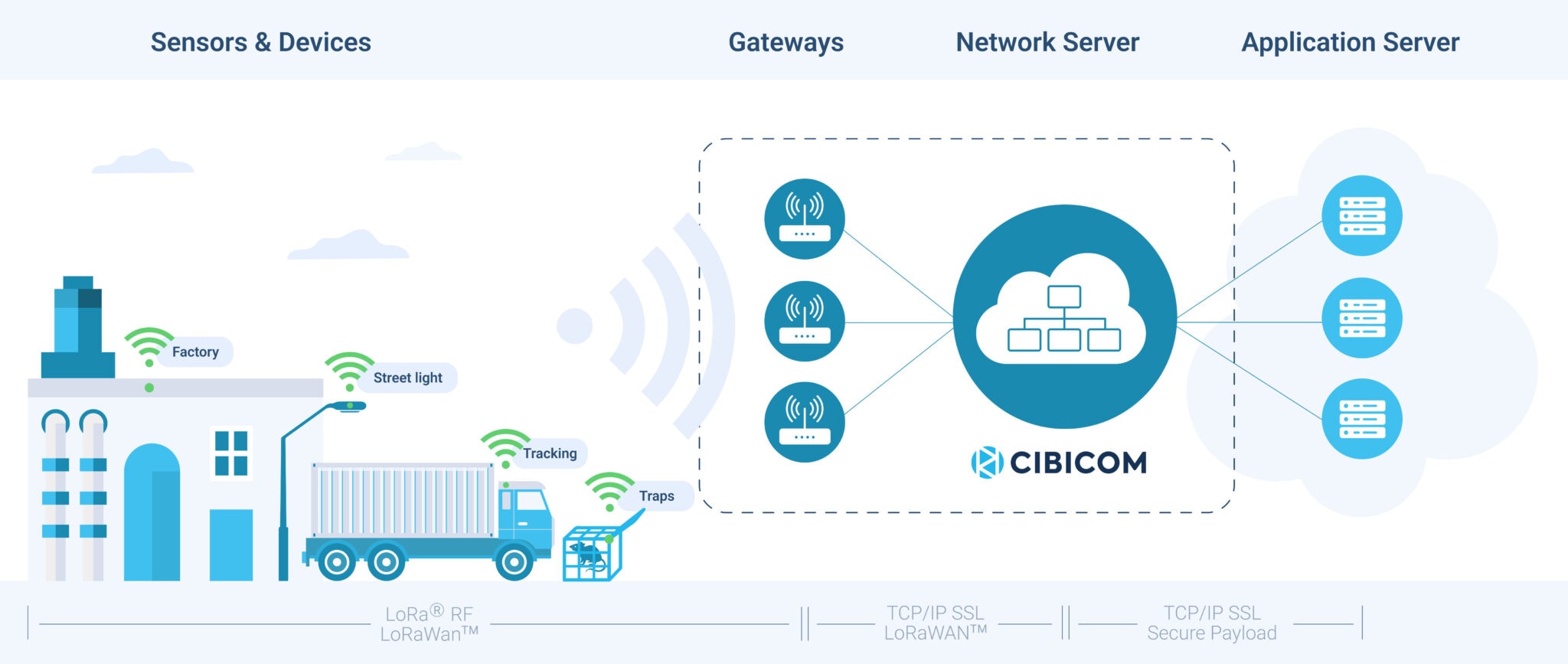 Sensorer og devices tracker bestemte metrics, der sendes videre til en gateway – via en bestemt netværksprotokol egnet til formålet som fx LoRaWAN®. Her er gatewayen afgørende for at kunne læse og forstå den opsamlede data fra sensorerne. Efter gatewayen har bearbejdet den opsamlede data, sendes dataen videre til en Network Server (Cloud) med almindelig internetadgang. Det gør det muligt for slutbrugeren at tilgå dataen, fx via en app (Application server).