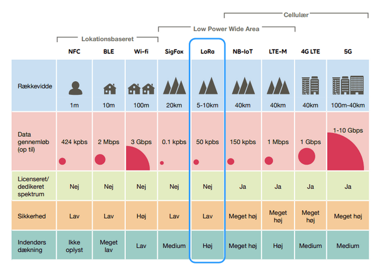 Fordelen ved at udnytte LoRaWAN®-netværksprotokollen i eksemplet foroven er, at sensorerne på marken ikke behøver at få skiftet batteri så ofte, idet energiforbruget holdes lavt grundet protokollens relativt lave gennemløb af data. På billedet nedenunder kan du se et overblik over populære netværksprotokoller, deres respektive datagennemløb (båndbredde) samt deres generelle rækkevidde.